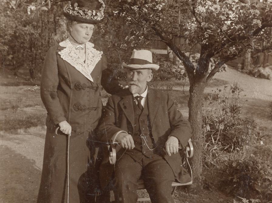 Bag fotografiet af den ældre mand med lys hat, der hviler sig på en havestol mens hans hustru med stok må stå ved siden af, gemmer der sig en lille interessant lokalhistorie.